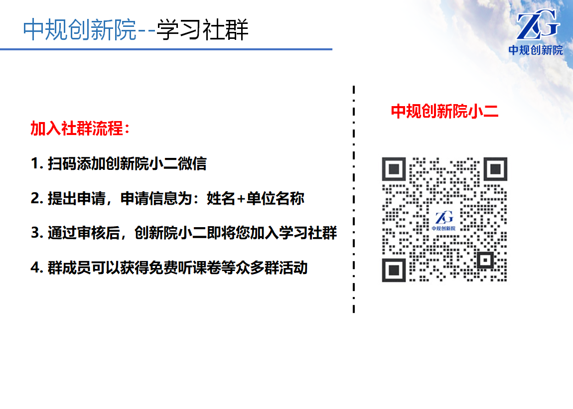 中規創新院在企業微信建立了學習社群,創新院的學員可通過學習社群討論知識產權知識、提出學習過程中的疑問、提出培訓課程的需求,并可第一時間獲得中規創新院的新上線課程信息。